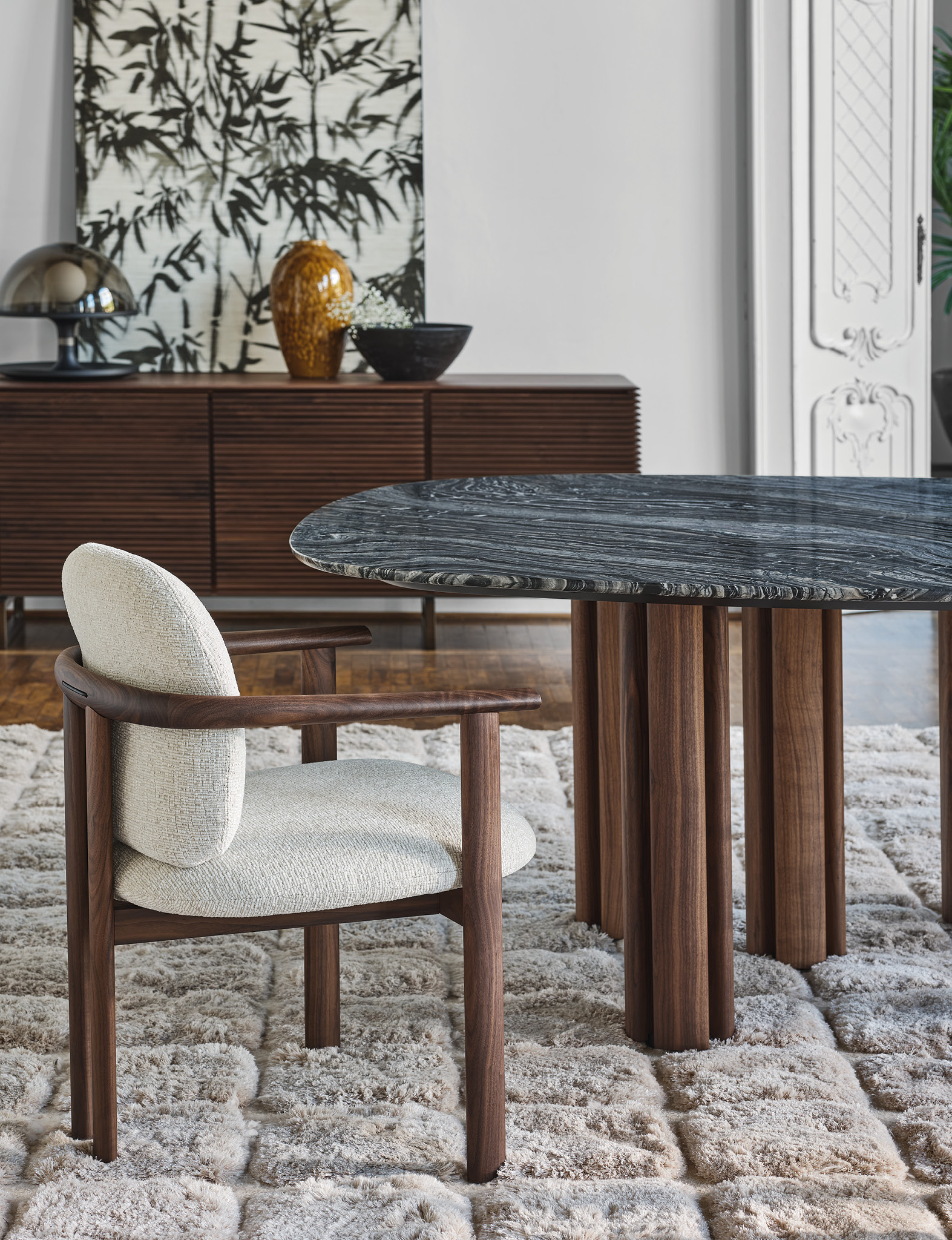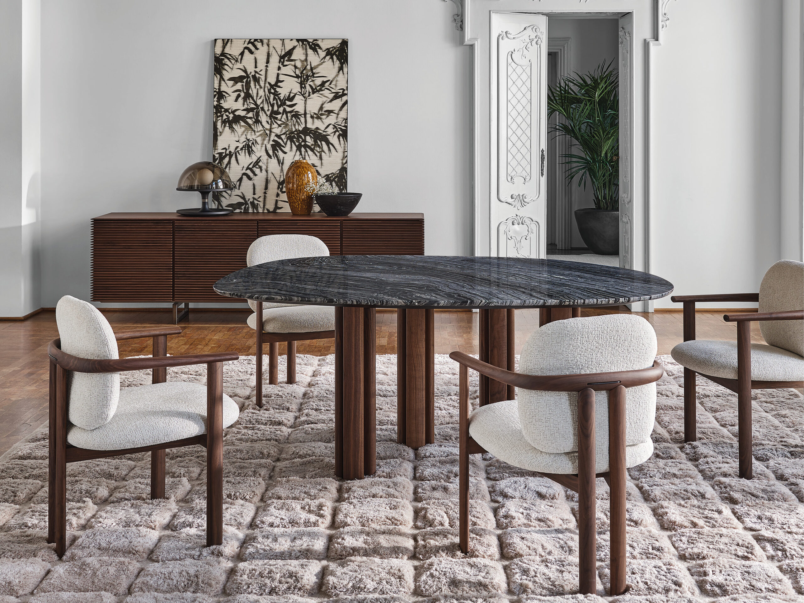 Mesa de comedor con tapa de mármol de forma orgánica y cinco o siete patas encajadas de nogal canletta o fresno macizo con pies en metal acabado negro mate.