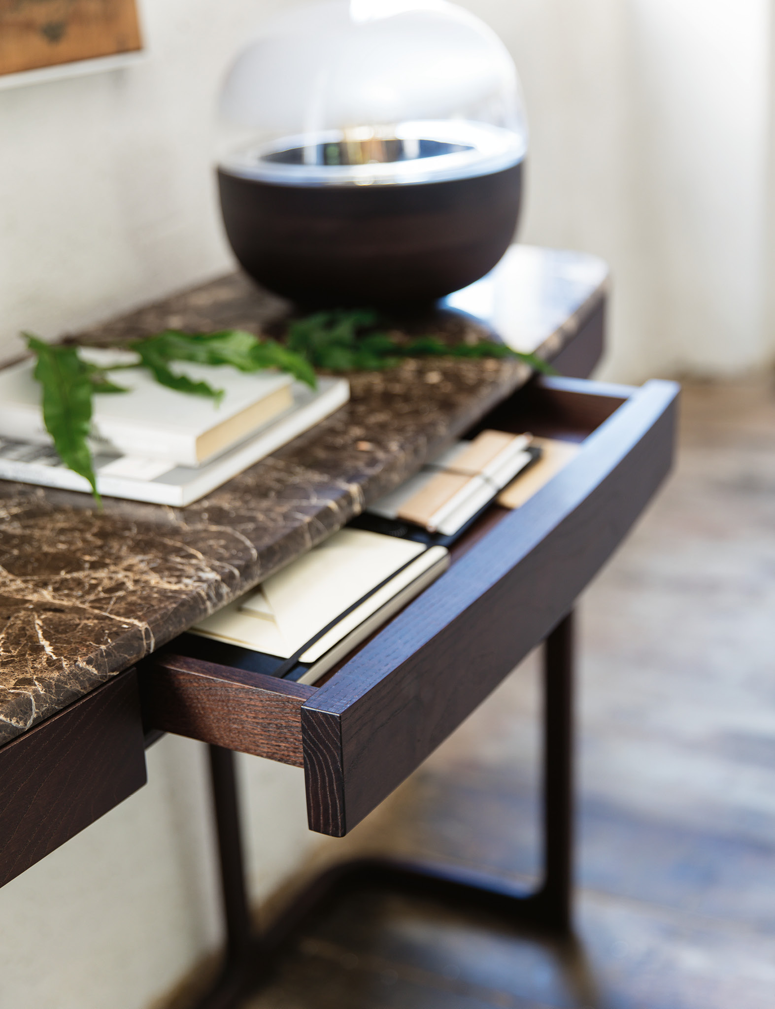 Consola con cajón con estructura en fresno macizo y tapa en mármol.
