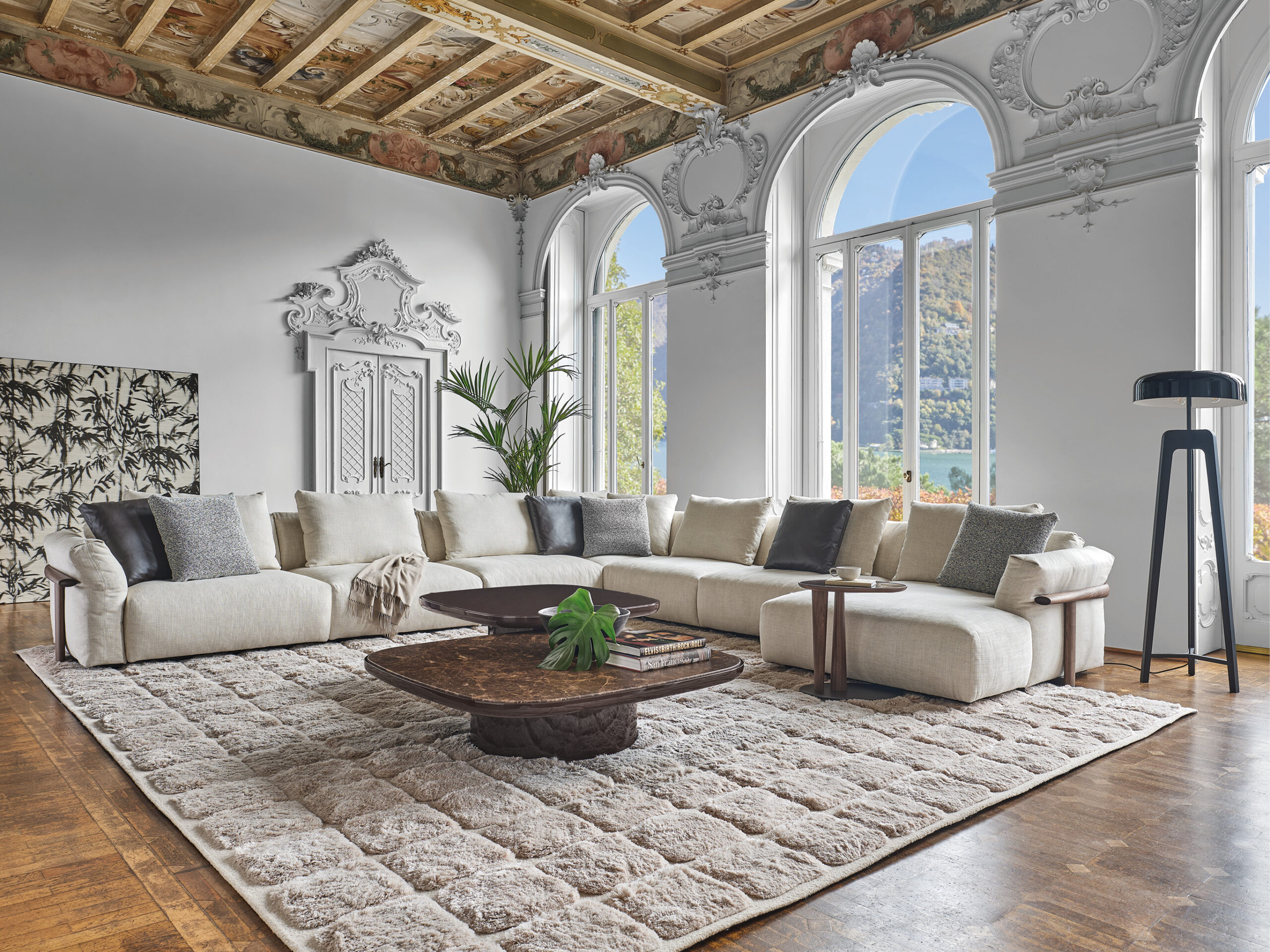 Il sistema modulare Ronny ridisegna il concetto di convivialità domestica con un linguaggio di forme ampie e generose, delicatamente sorrette da una struttura lignea che ne esalta l’anima materica. Ogni modulo – lineare, angolare o chaise longue – dialoga con l’altro in composizioni modulari, consentendo di creare scenografie anche di ampio respiro a seconda delle necessità di progetto. La struttura interna è studiata per conferire il massimo del comfort, composta da elementi in multistrato di legno e massello di pioppo e abete, a cui è abbinato un sistema di cinghie elastiche posizionate nel senso della seduta, e tra loro parallele, per garantire elasticità e comodità alla seduta. L’imbottitura è in poliuretano espanso a quote differenziate, con un doppio strato ad alta e a bassa portanza, mentre nella sezione frontale è posizionata una fascia con rigidità più consistente, per un maggiore supporto delle gambe. Lo strato più superficiale è arricchito da gomma termosensibile per massimizzare il comfort. L’imbottitura è infine completamente avvolta da un trapuntino imbottito 100% piuma d’oca canalizzata, a sua volta inserito in una fodera esterna in tela che evita l’accidentale fuori uscita di piume. I morbidi cuscini tessili seguono la silhouette della struttura in legno disegnando linee morbide e avvolgenti, pieghe e pinces che diventano le caratteristiche proprie dell’estetica di Ronny. Dal punto di vista estetico, Ronny è rivestibile nei tessuti della collezione Porada, sfoderabile in tessuto, non sforedabile in pelle.