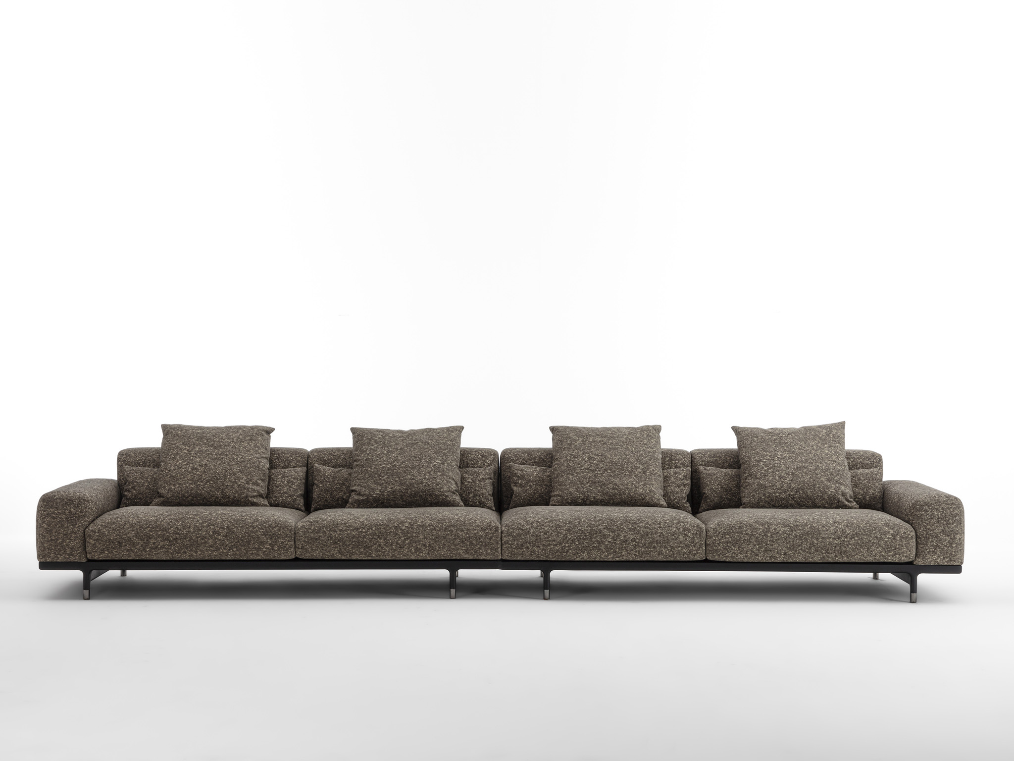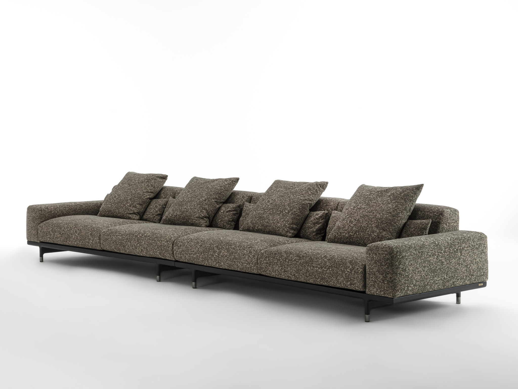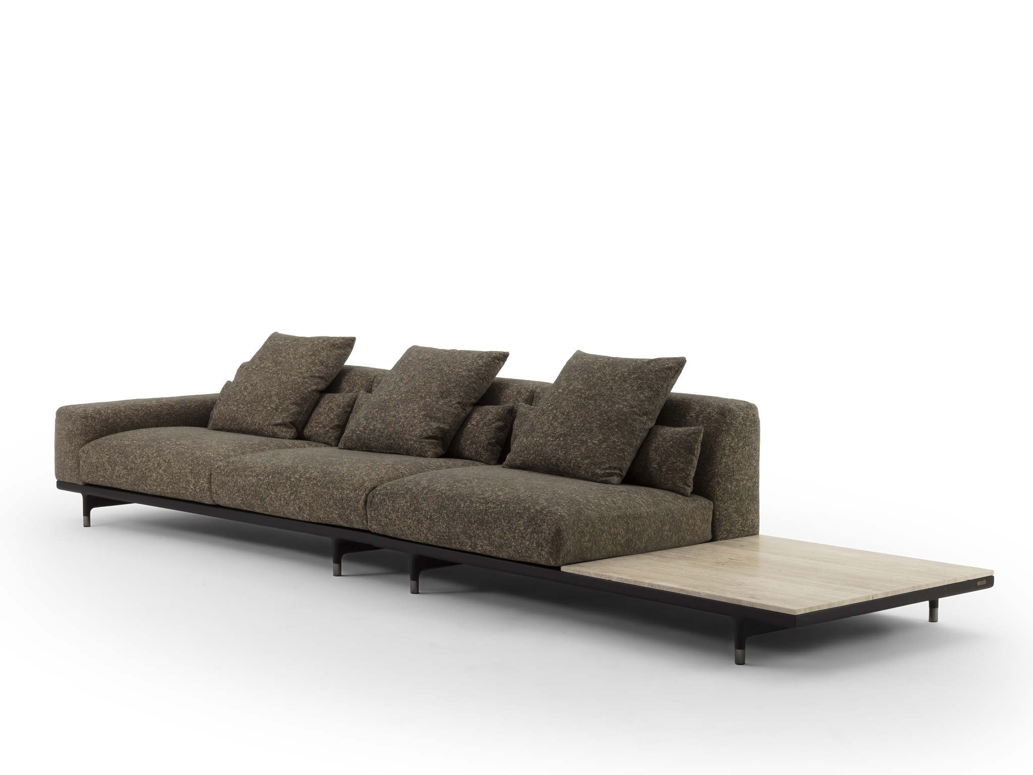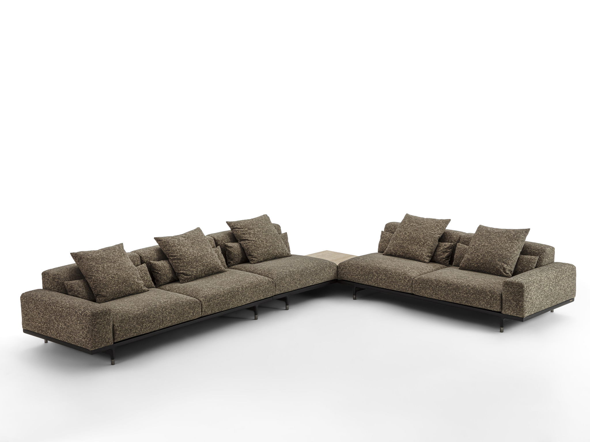 Modular seating system with base in solid canaletta walnut and metal caps with brushed brass or black chromed finish. Removable upholstery in the fabrics of the collection, leather upholstery cannot be removed. Seat cushions padded with differentiated-density polyurethane foam with upper part in memory foam. Optional lumbar cushions padded with goose down baffle (Gold label according to the Assopiuma certification standard). The bases come in five widths (170, 195, 220, 245, and 270 cm) to accomodate seating elements, storage units (25 cm) and coffee tables (25, 50, and 110 cm widths). Available in 2 different depths (90 cm and 110 cm).