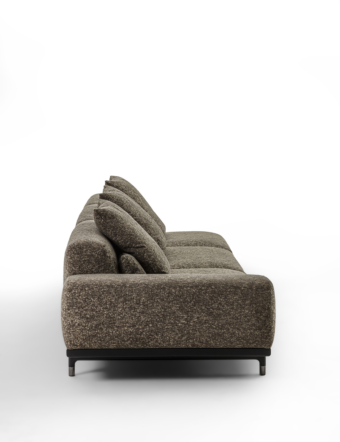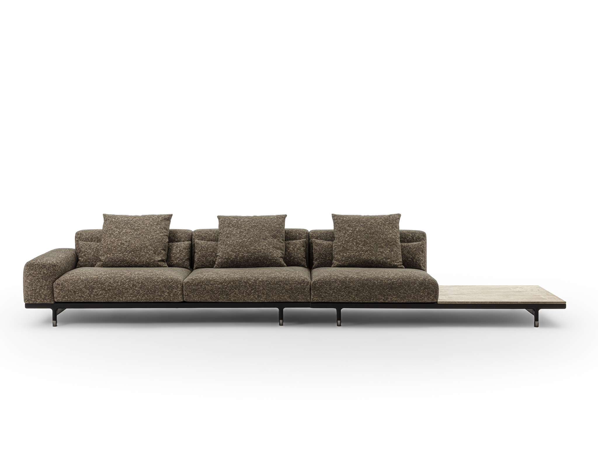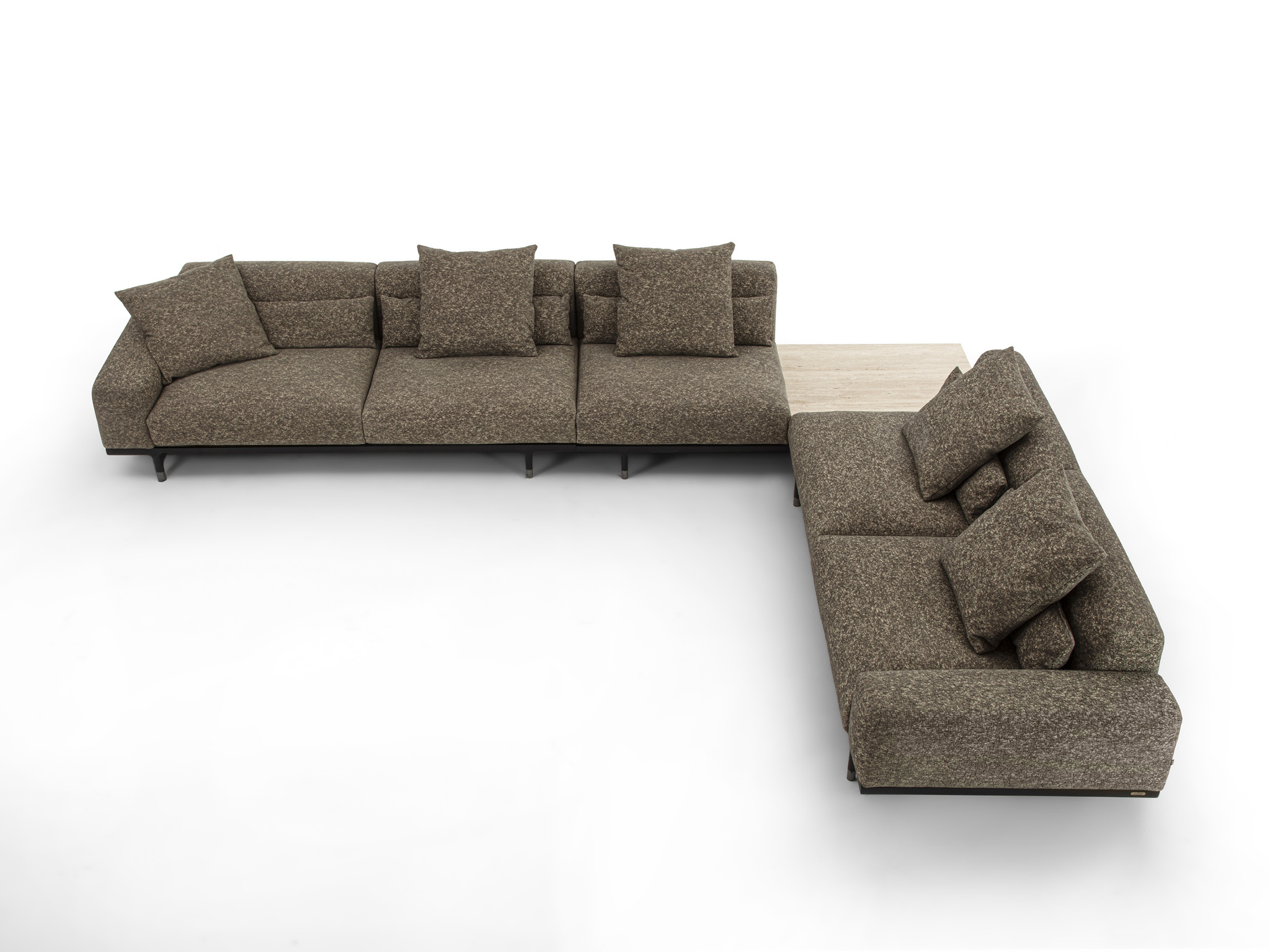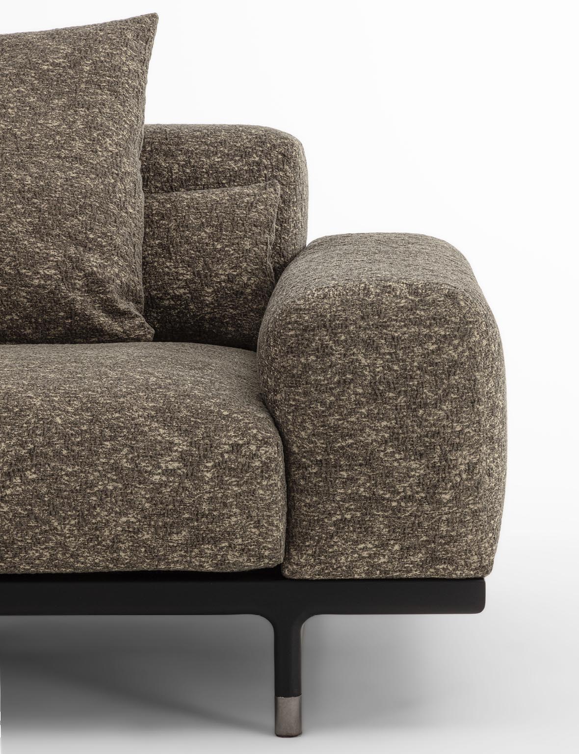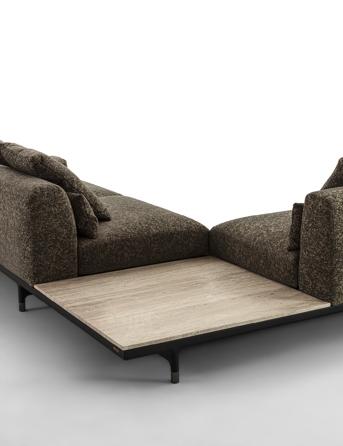 Modular seating system with base in solid canaletta walnut and metal caps with brushed brass or black chromed finish. Removable upholstery in the fabrics of the collection, leather upholstery cannot be removed. Seat cushions padded with differentiated-density polyurethane foam with upper part in memory foam. Optional lumbar cushions padded with goose down baffle (Gold label according to the Assopiuma certification standard). The bases come in five widths (170, 195, 220, 245, and 270 cm) to accomodate seating elements, storage units (25 cm) and coffee tables (25, 50, and 110 cm widths). Available in 2 different depths (90 cm and 110 cm).