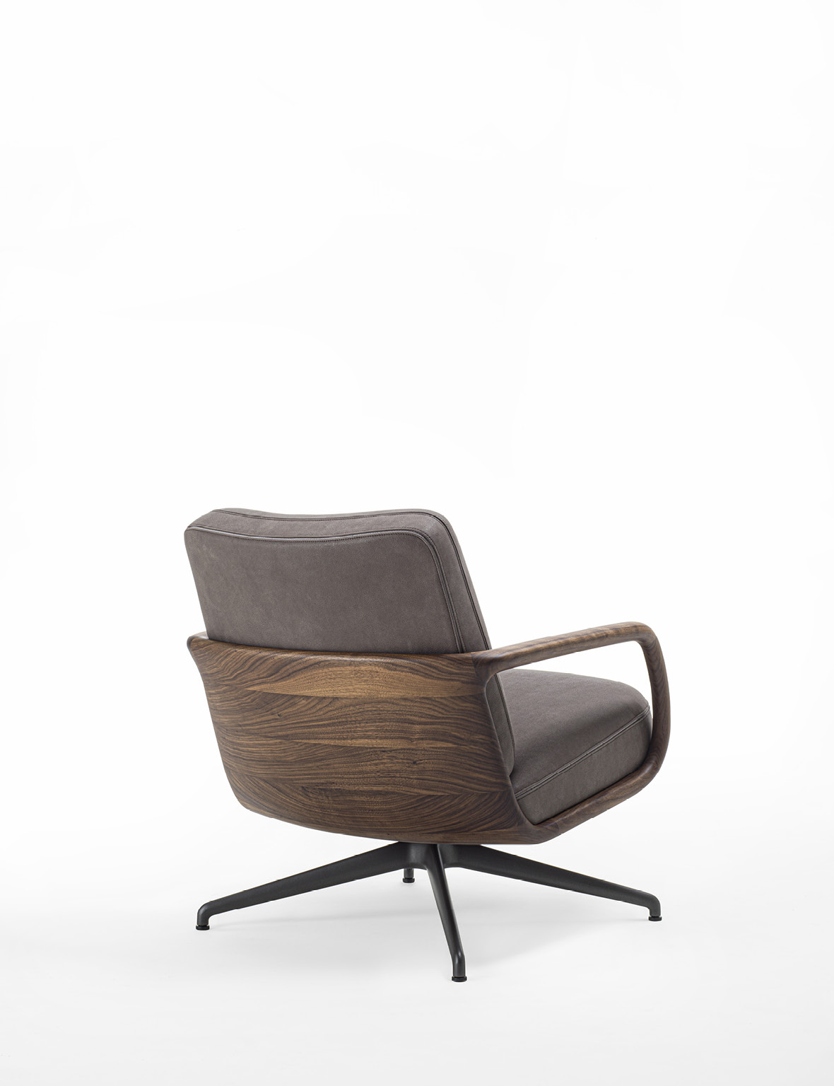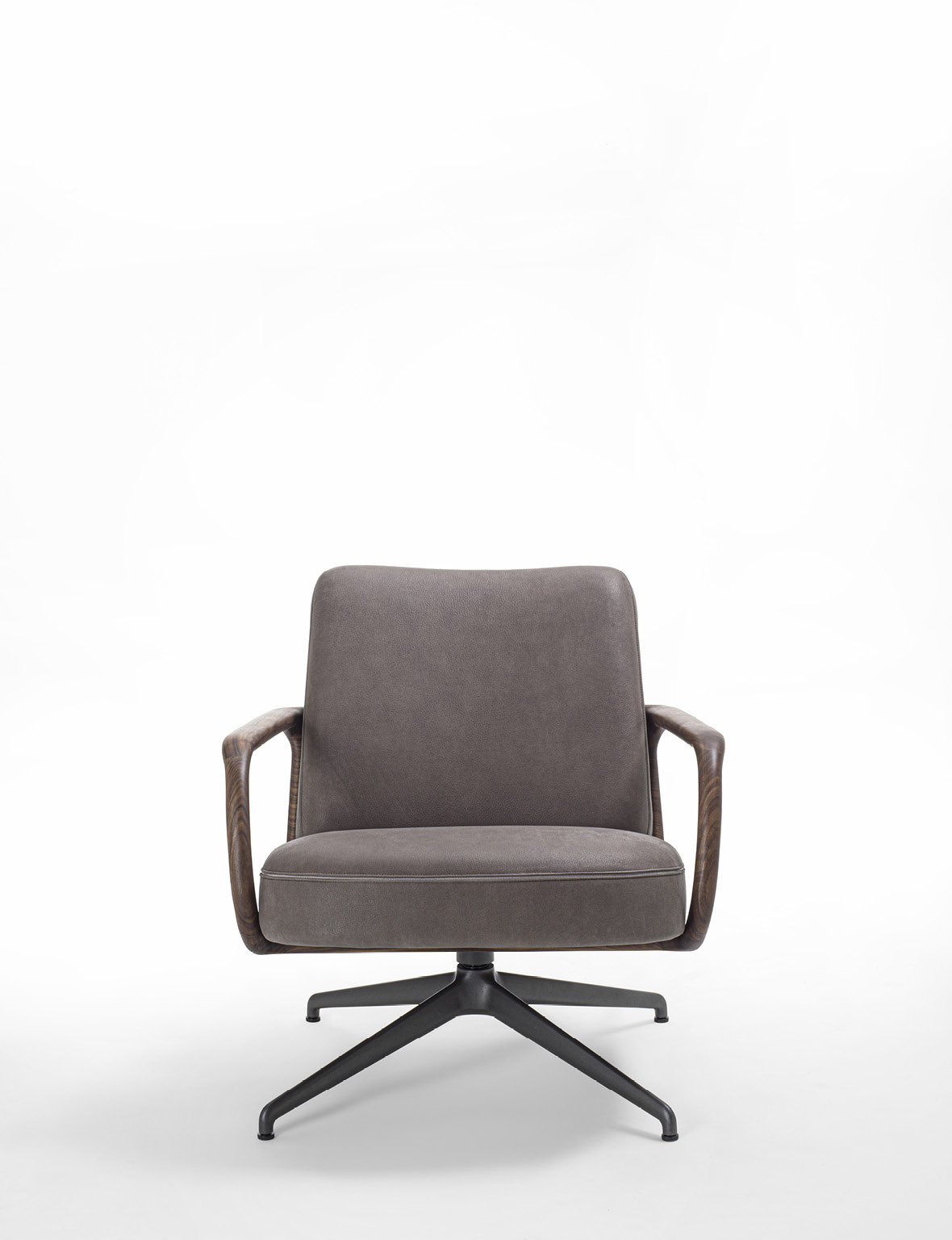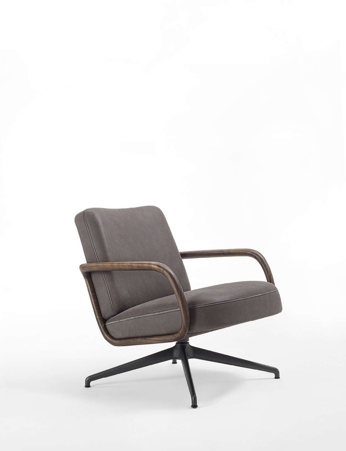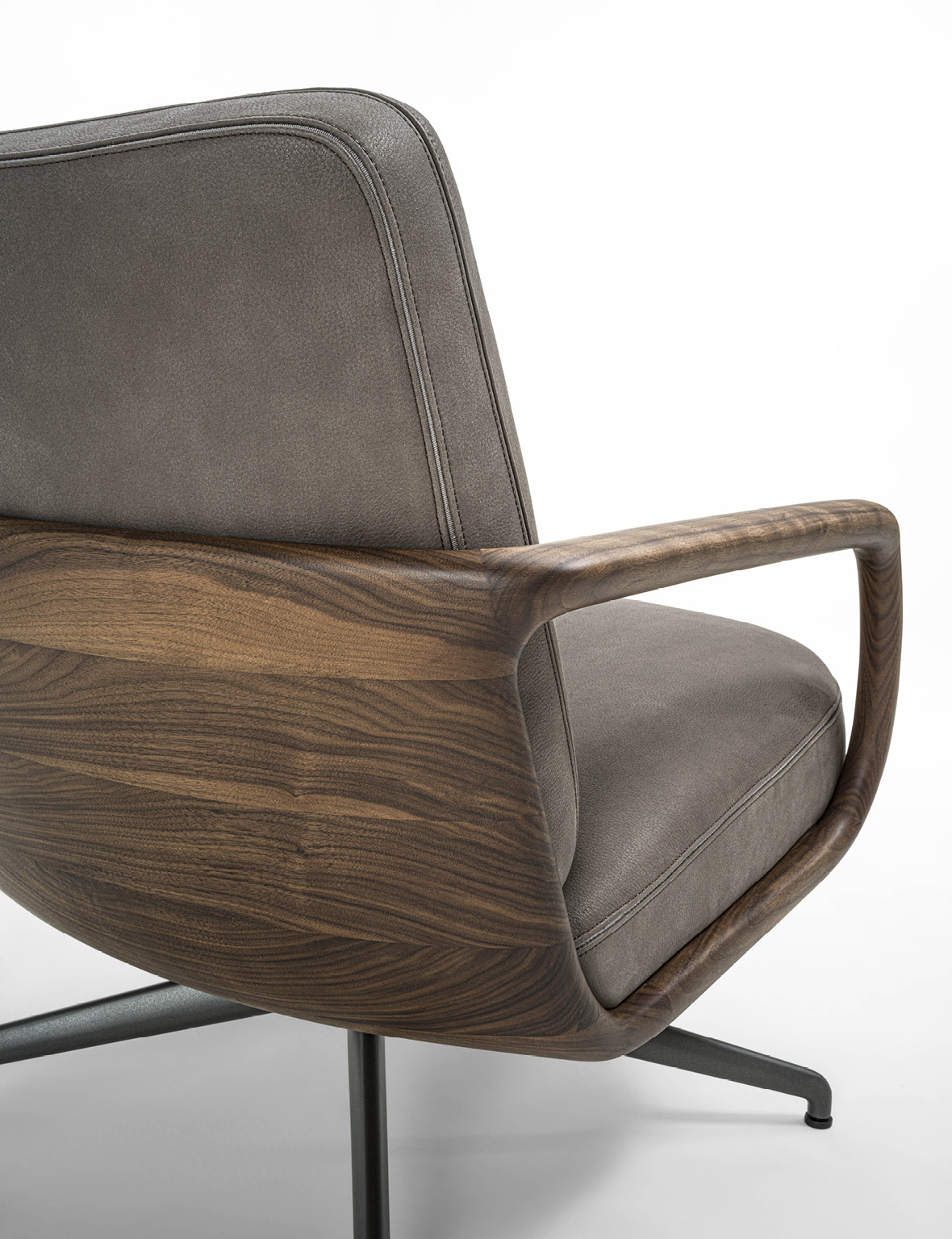 Cuna Lounge Low evolves from the Cuna executive armchair, conceived as a solution for living environments. The design preserves the collection’s aesthetic language, inspired by the timeless elegance of 1950s design. The structure is defined by a solid Canaletta walnut shell, crafted to form a continuous curved line that envelops the seat and backrest. This fluid gesture creates a dialogue between structure and upholstery, with cushions that naturally follow the shell’s silhouette. The broader proportions and increased seat depth enhance overall comfort, further supported by ergonomic cushioning. Upholstery options, available in the collection’s fabrics, allow for wide customization while emphasizing Porada’s signature tailoring. From a technical standpoint, Cuna Lounge Low retains the synchronized swivel mechanism, ensuring continuity within the collection and versatility in both residential and contract contexts.