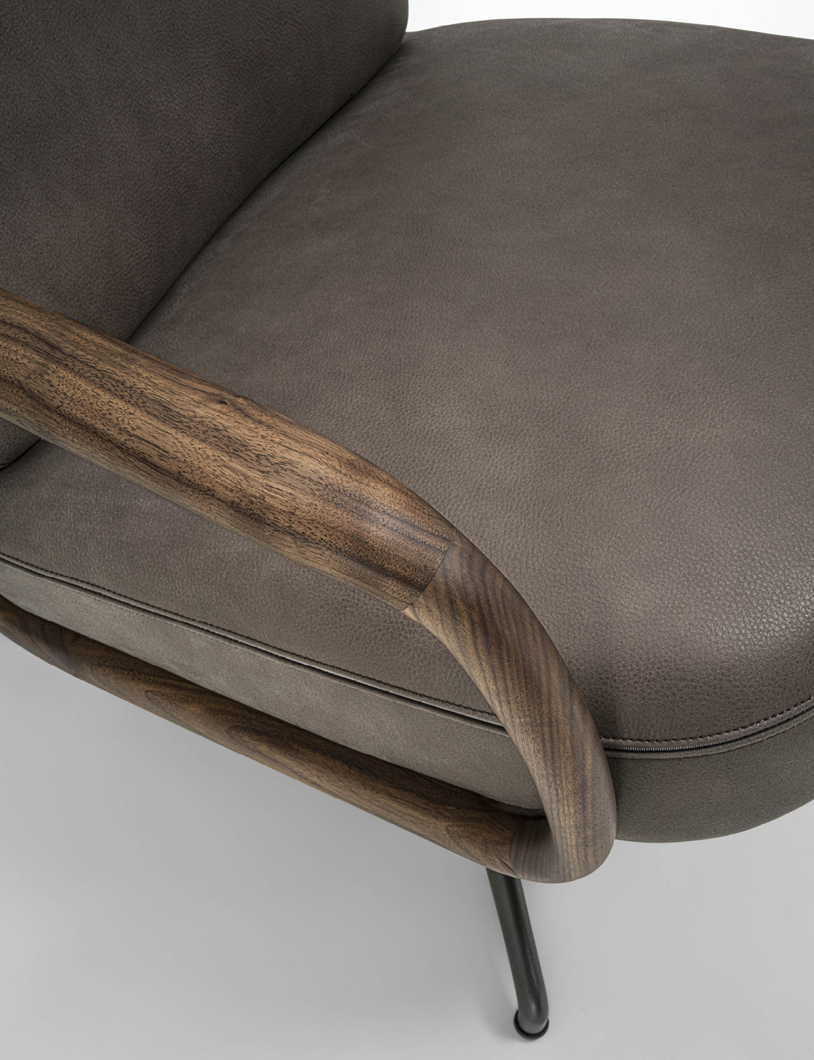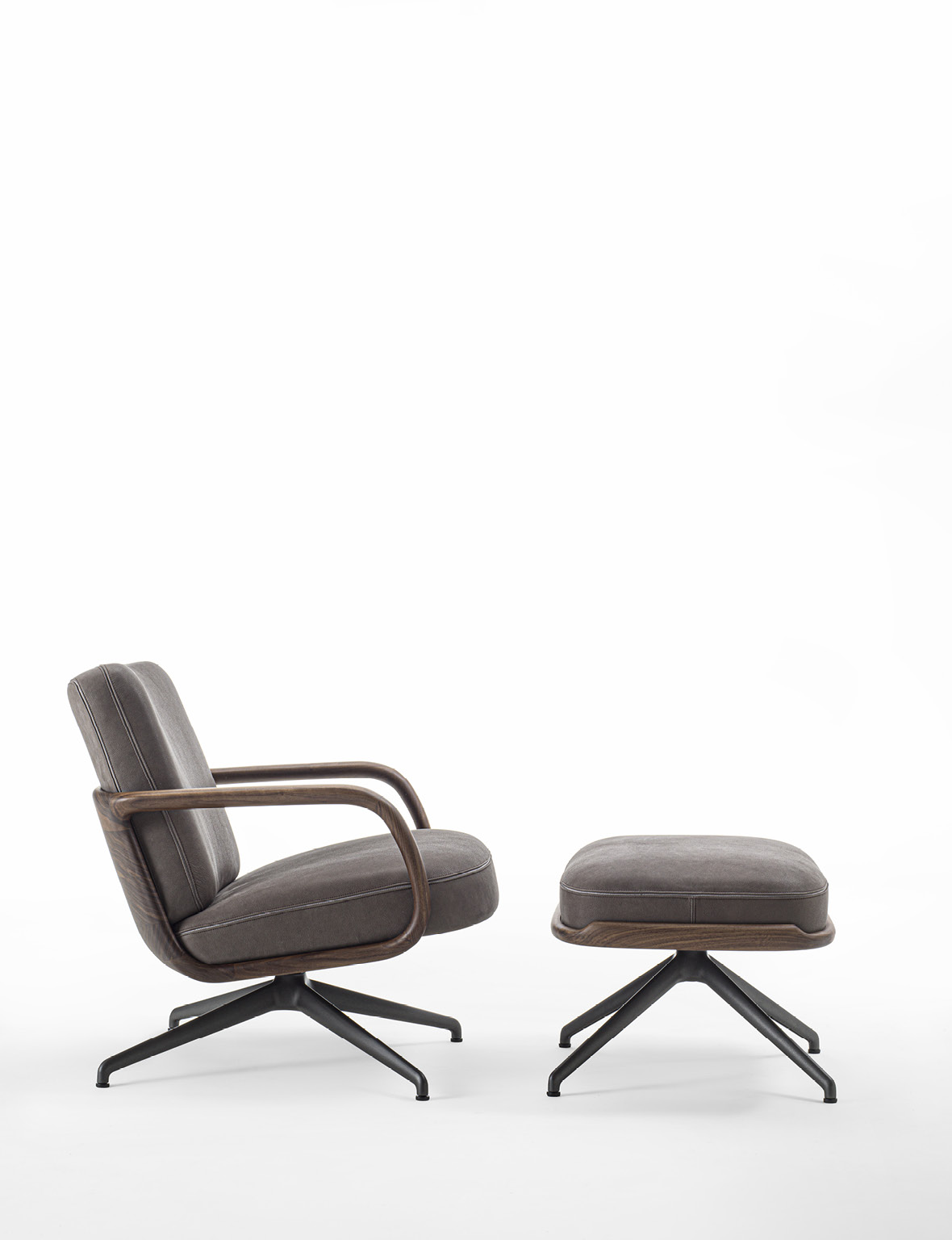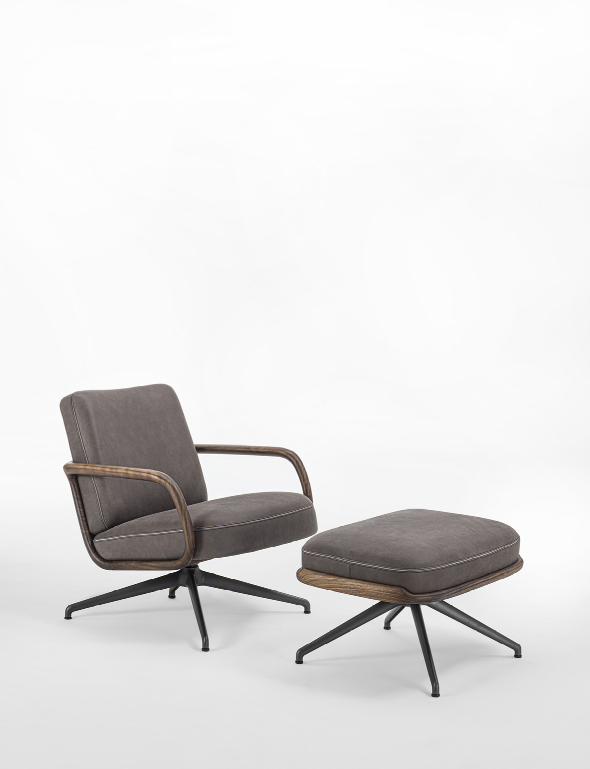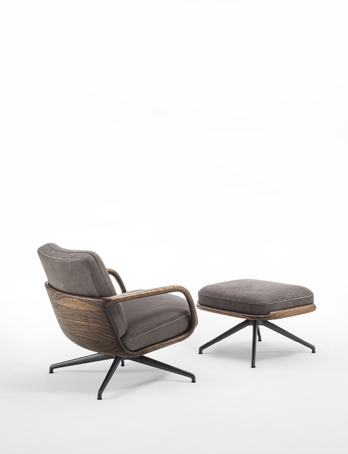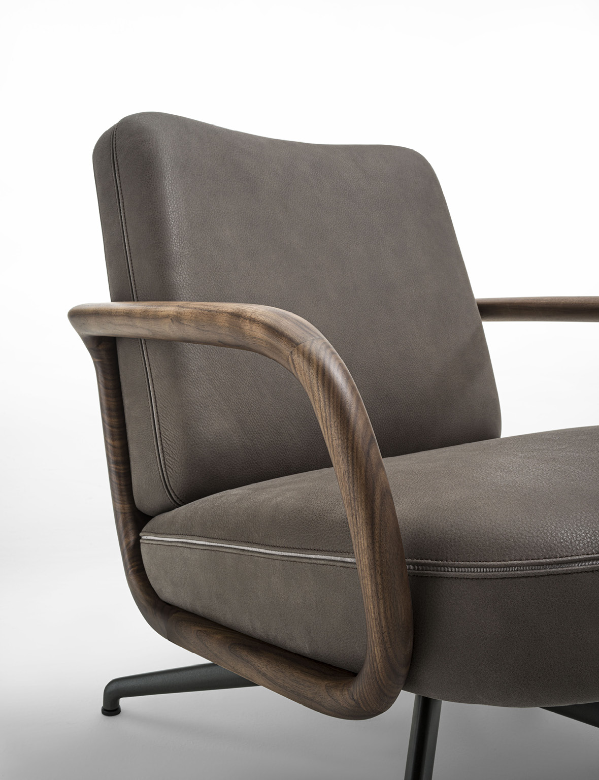 Cuna Lounge Low evolves from the Cuna executive armchair, conceived as a solution for living environments. The design preserves the collection’s aesthetic language, inspired by the timeless elegance of 1950s design. The structure is defined by a solid Canaletta walnut shell, crafted to form a continuous curved line that envelops the seat and backrest. This fluid gesture creates a dialogue between structure and upholstery, with cushions that naturally follow the shell’s silhouette. The broader proportions and increased seat depth enhance overall comfort, further supported by ergonomic cushioning. Upholstery options, available in the collection’s fabrics, allow for wide customization while emphasizing Porada’s signature tailoring. From a technical standpoint, Cuna Lounge Low retains the synchronized swivel mechanism, ensuring continuity within the collection and versatility in both residential and contract contexts.