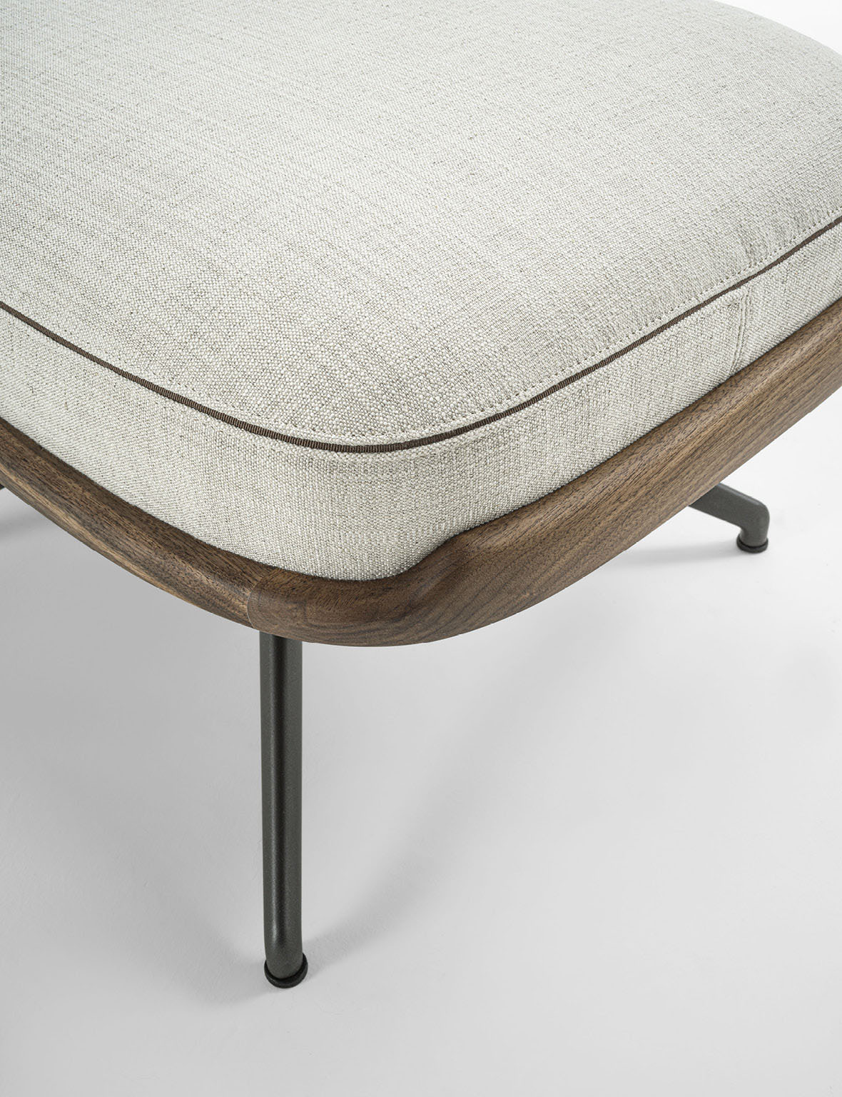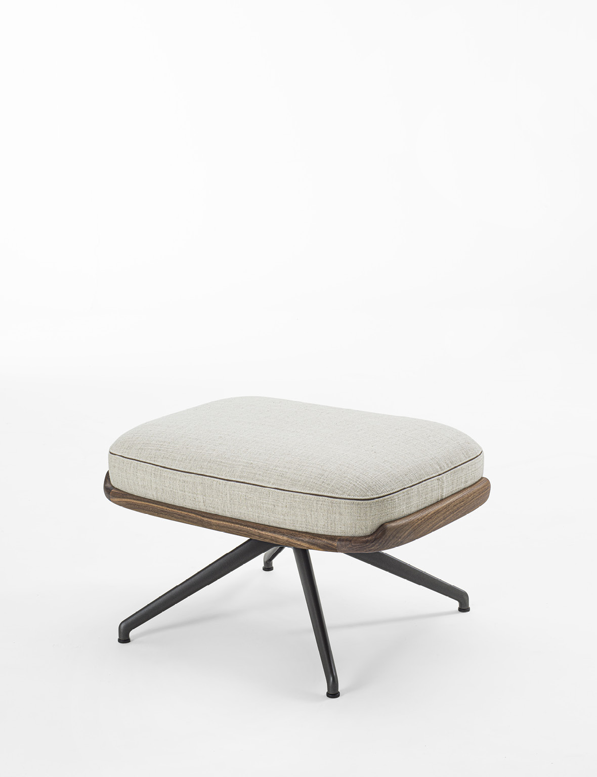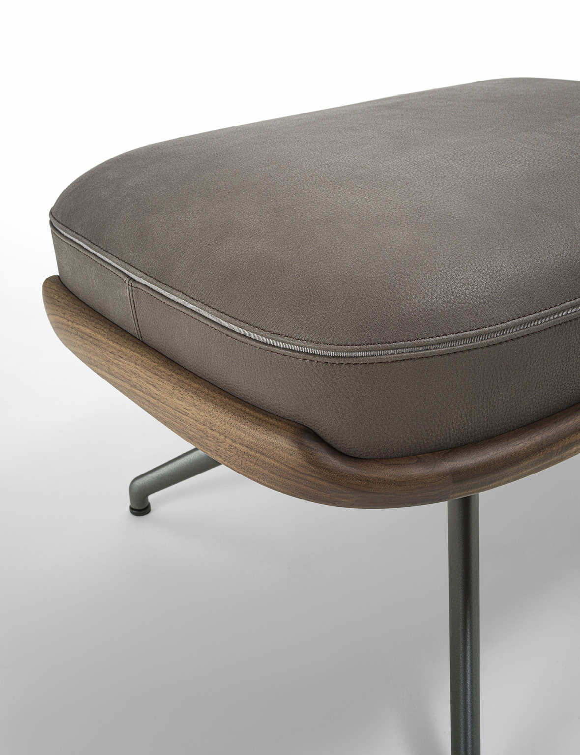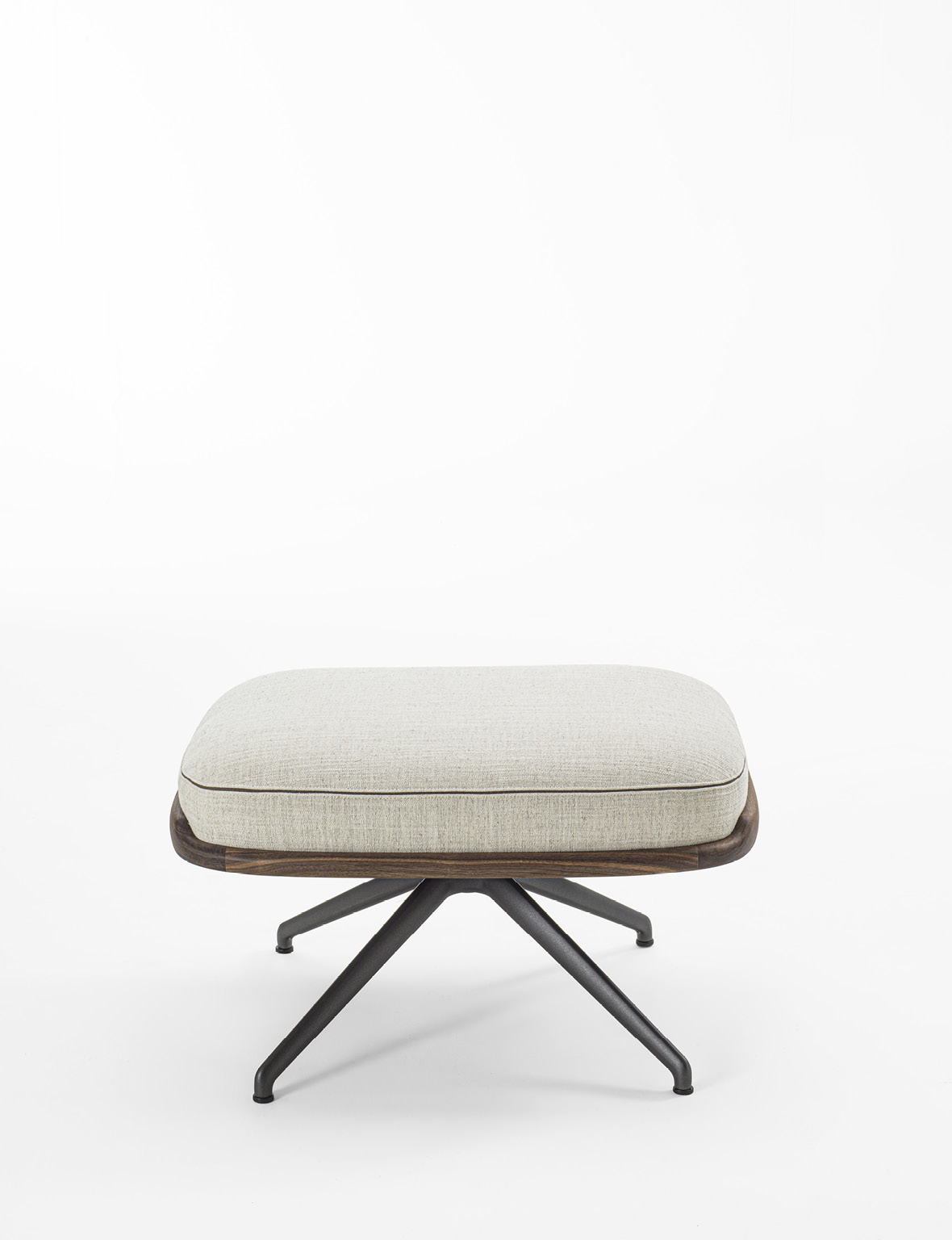 Cuna Lounge Pouf is conceived as the natural complement to the Cuna Lounge armchair, echoing its material language and maintaining the reference to the elegant, timeless lines of 1950s design, reinterpreted through a contemporary lens. Its defining feature is the solid Canaletta walnut frame, which embraces the upholstered cushion, outlining its profile and creating a refined contrast between the warmth of wood and the softness of the covering. The pouf is supported by a four-spoke metal base that lends visual lightness and connects aesthetically with the silhouette of the Cuna executive chair. Designed as either a complement to the armchair or a standalone seat, Cuna Lounge Pouf integrates seamlessly into living, lounge, and contract environments. The cushion upholstery is available in fabrics from the collection, offering extensive customization and highlighting Porada’s tailored craftsmanship.