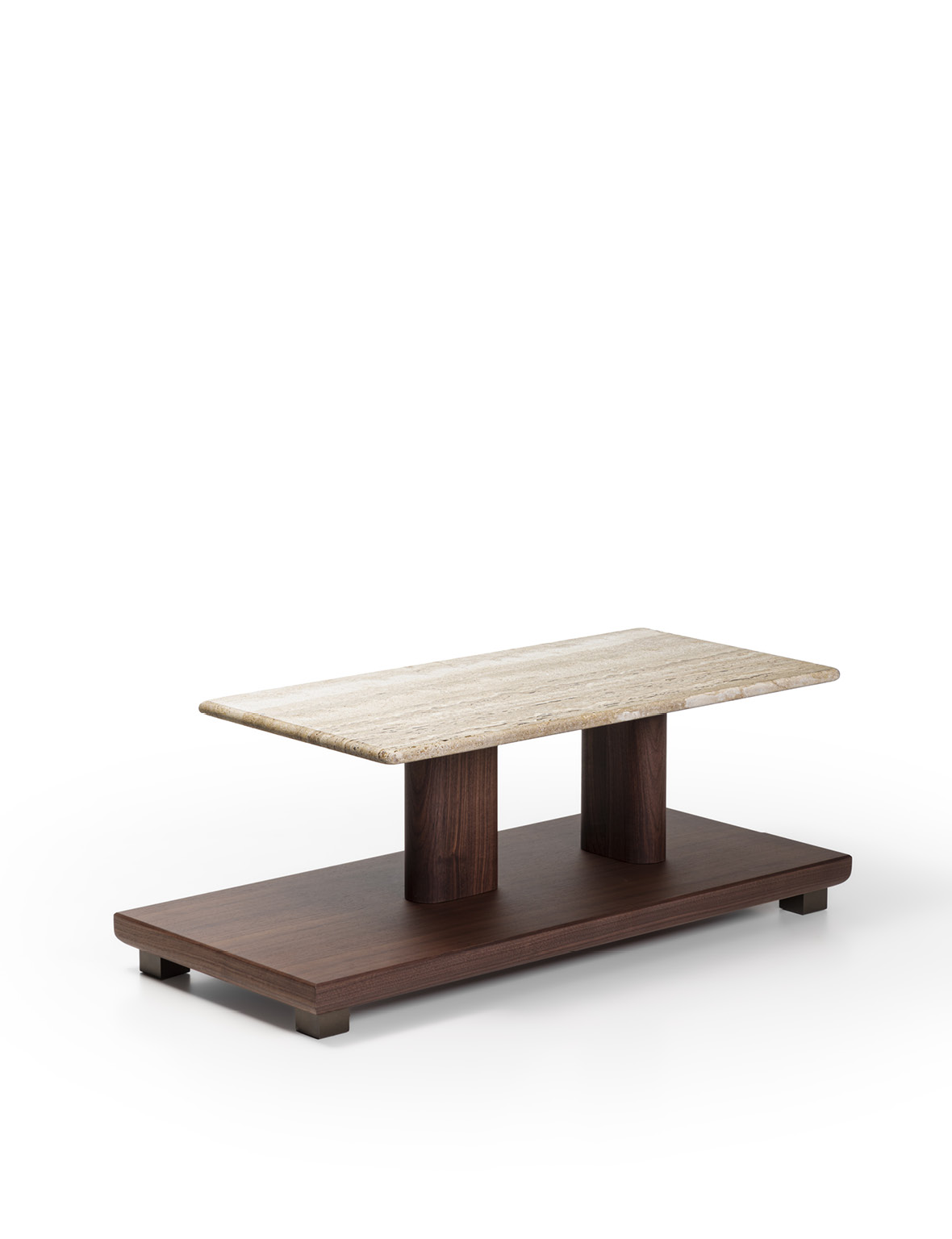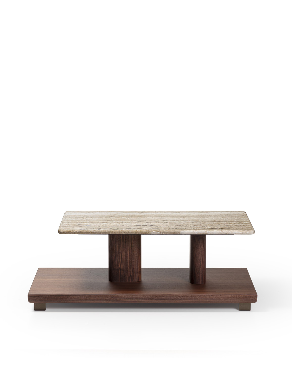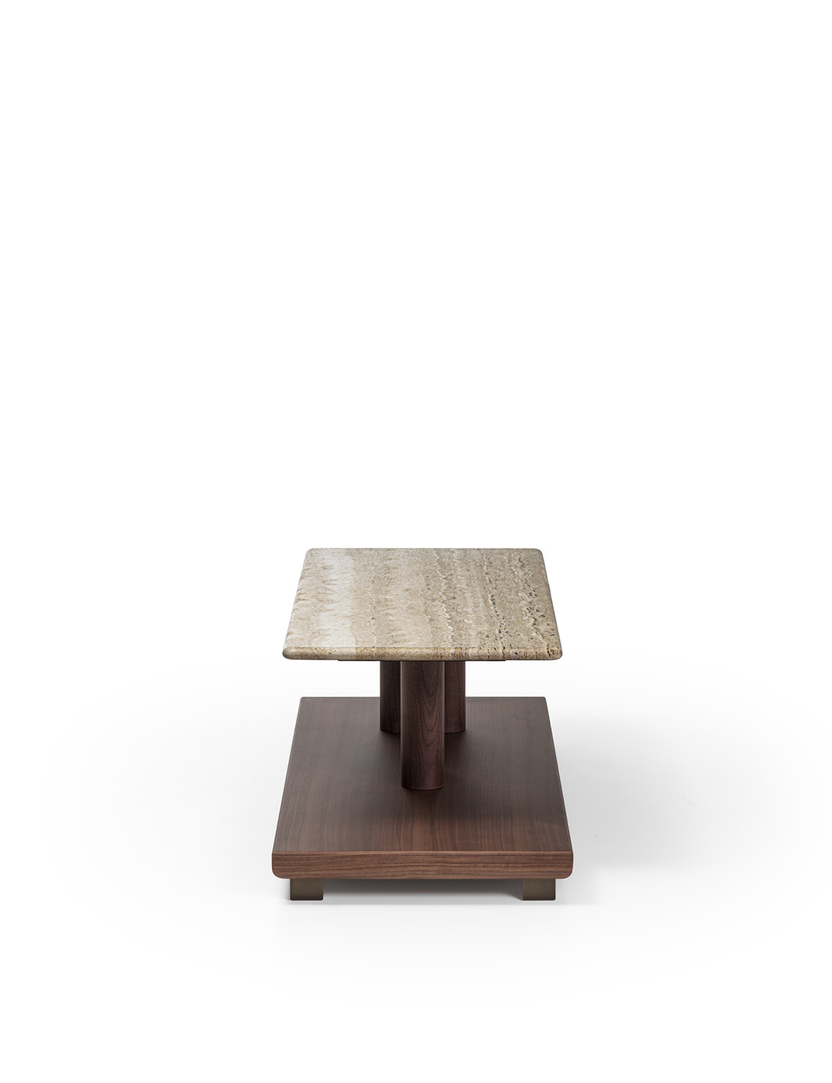 Collection of coffee tables for Kirk sofa with base in solid canaletta walnut supported by Bronzoro-finish metal feet.