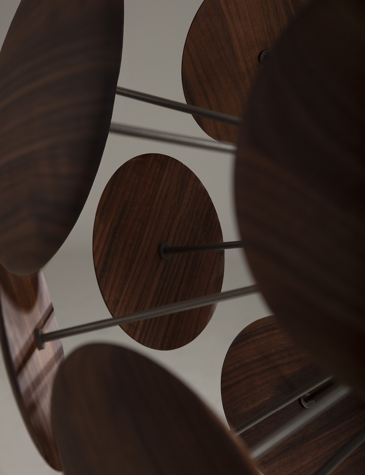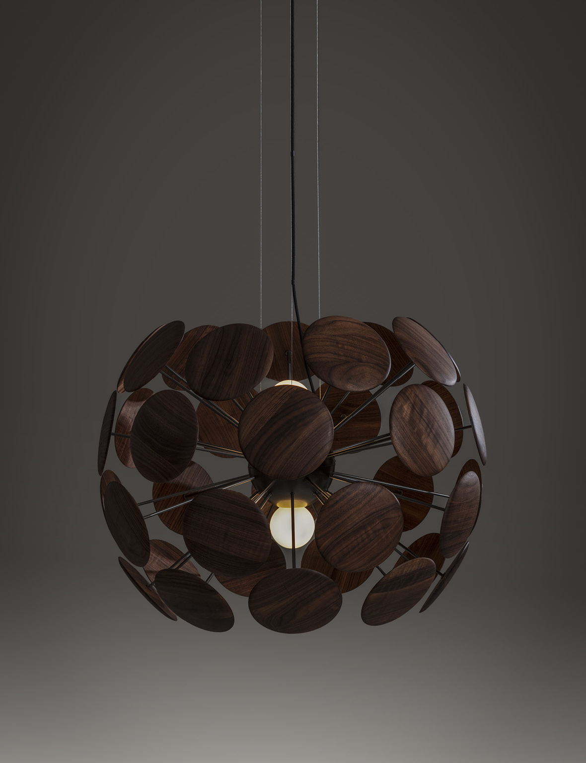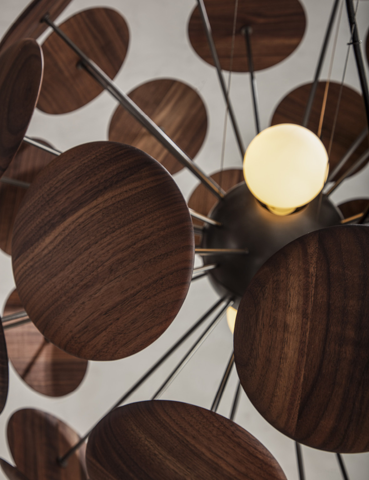 Ortensia is a pendant lamp distinguished by its strong theatrical presence, capturing attention and defining space with elegance. Inspired by the complexity of the flower from which it takes its name, Ortensia reinterprets its form and aesthetic into a design composition that combines expressive strength with visual lightness. The silhouette develops through a sequence of elements in solid Canaletta walnut and oak, carefully arranged to create a balance between solids and voids, resulting in an airy and elegant structure. Light filters through the wooden discs, creating chiaroscuro effects that enhance the material richness of the wood. Ortensia transcends its functional role to become a focal point, enriching interiors with a sophisticated and distinctive presence.