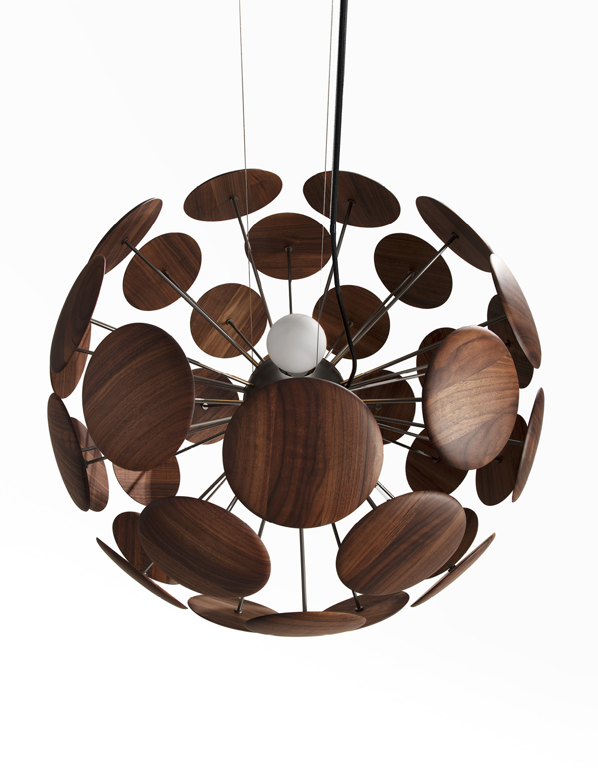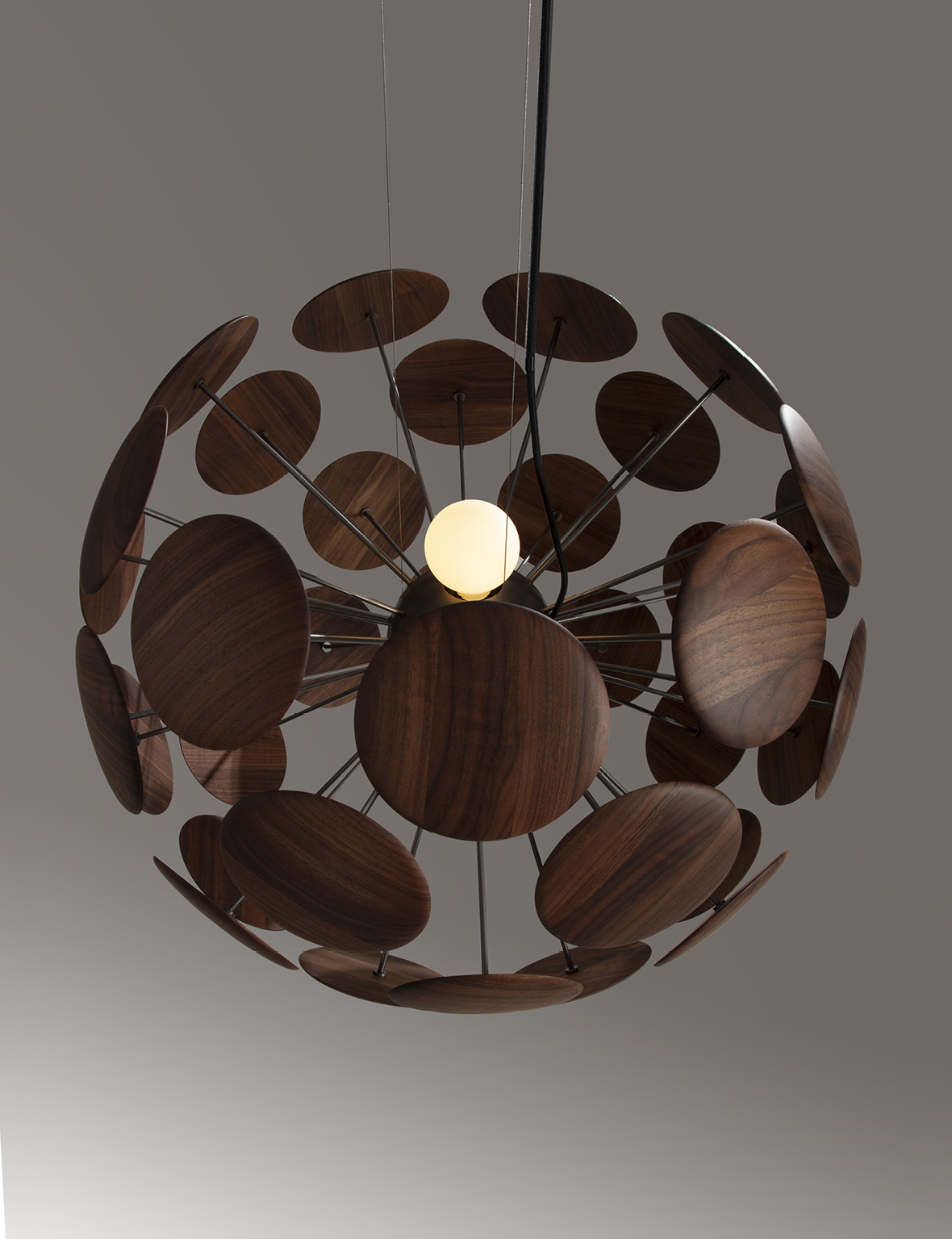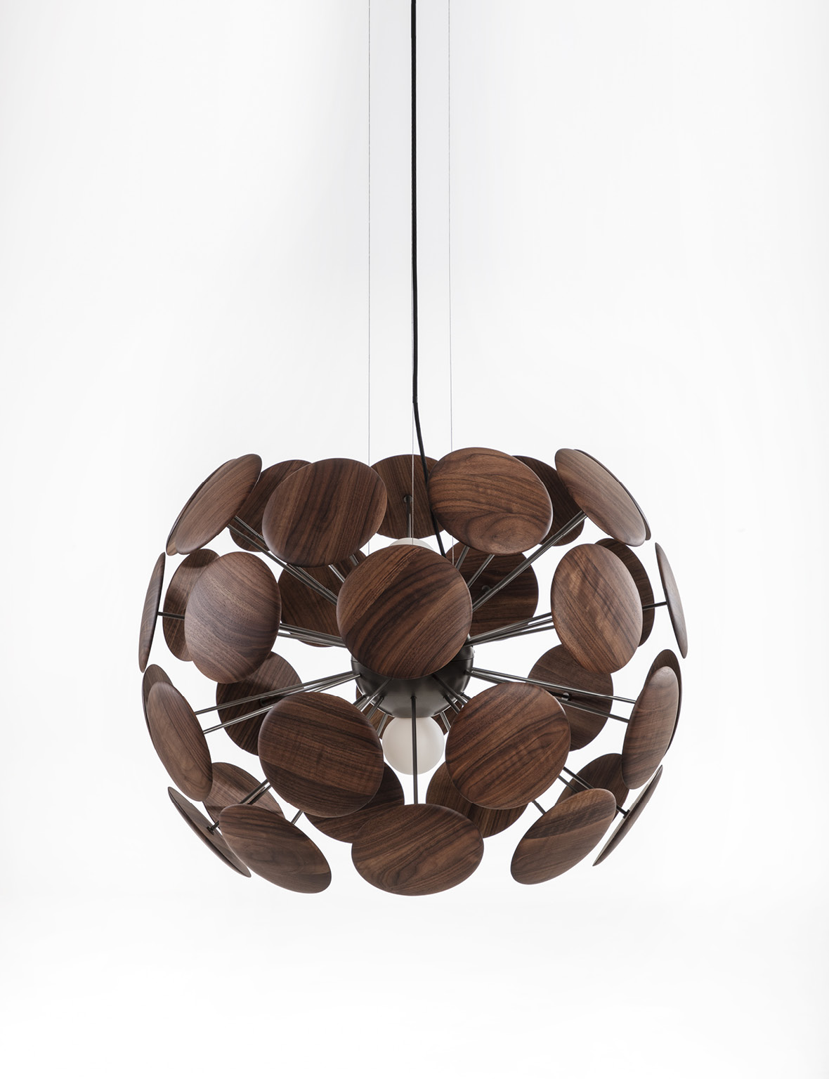 Ortensia is a pendant lamp distinguished by its strong theatrical presence, capturing attention and defining space with elegance. Inspired by the complexity of the flower from which it takes its name, Ortensia reinterprets its form and aesthetic into a design composition that combines expressive strength with visual lightness. The silhouette develops through a sequence of elements in solid Canaletta walnut and oak, carefully arranged to create a balance between solids and voids, resulting in an airy and elegant structure. Light filters through the wooden discs, creating chiaroscuro effects that enhance the material richness of the wood. Ortensia transcends its functional role to become a focal point, enriching interiors with a sophisticated and distinctive presence.