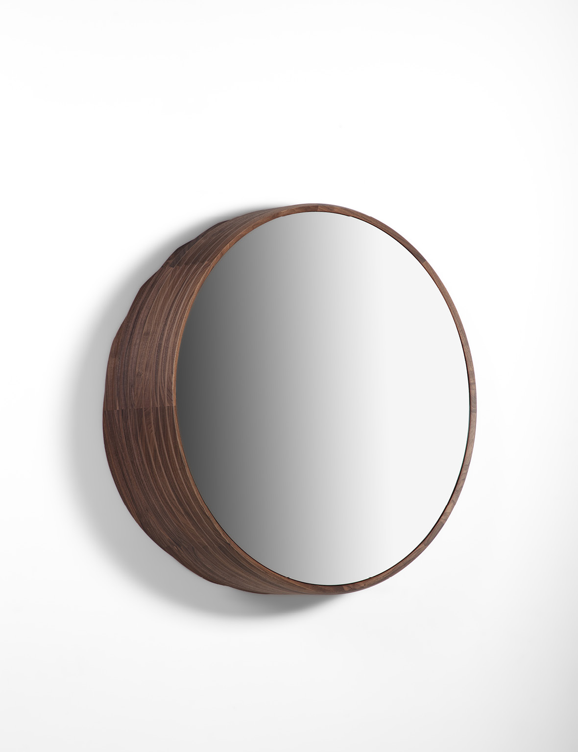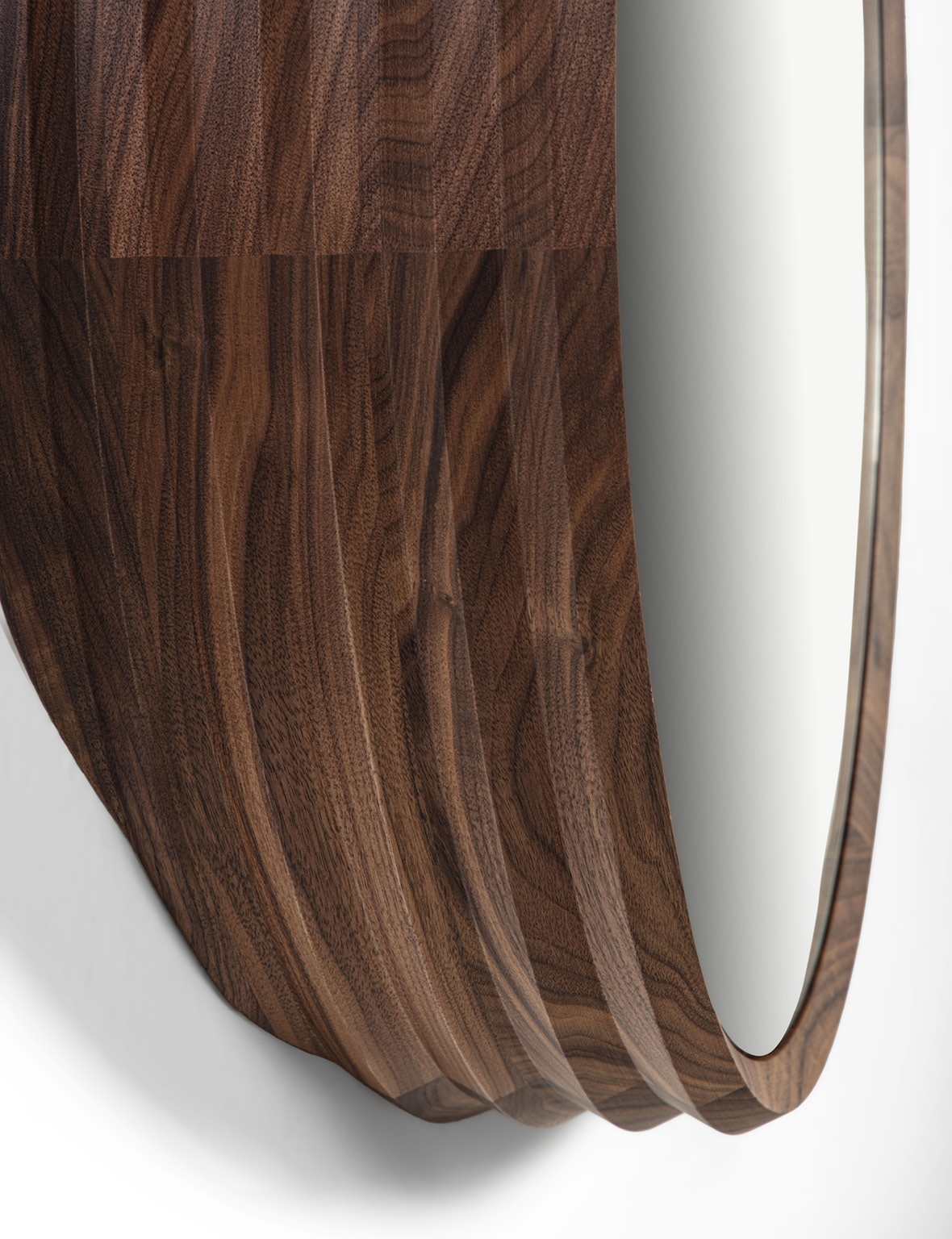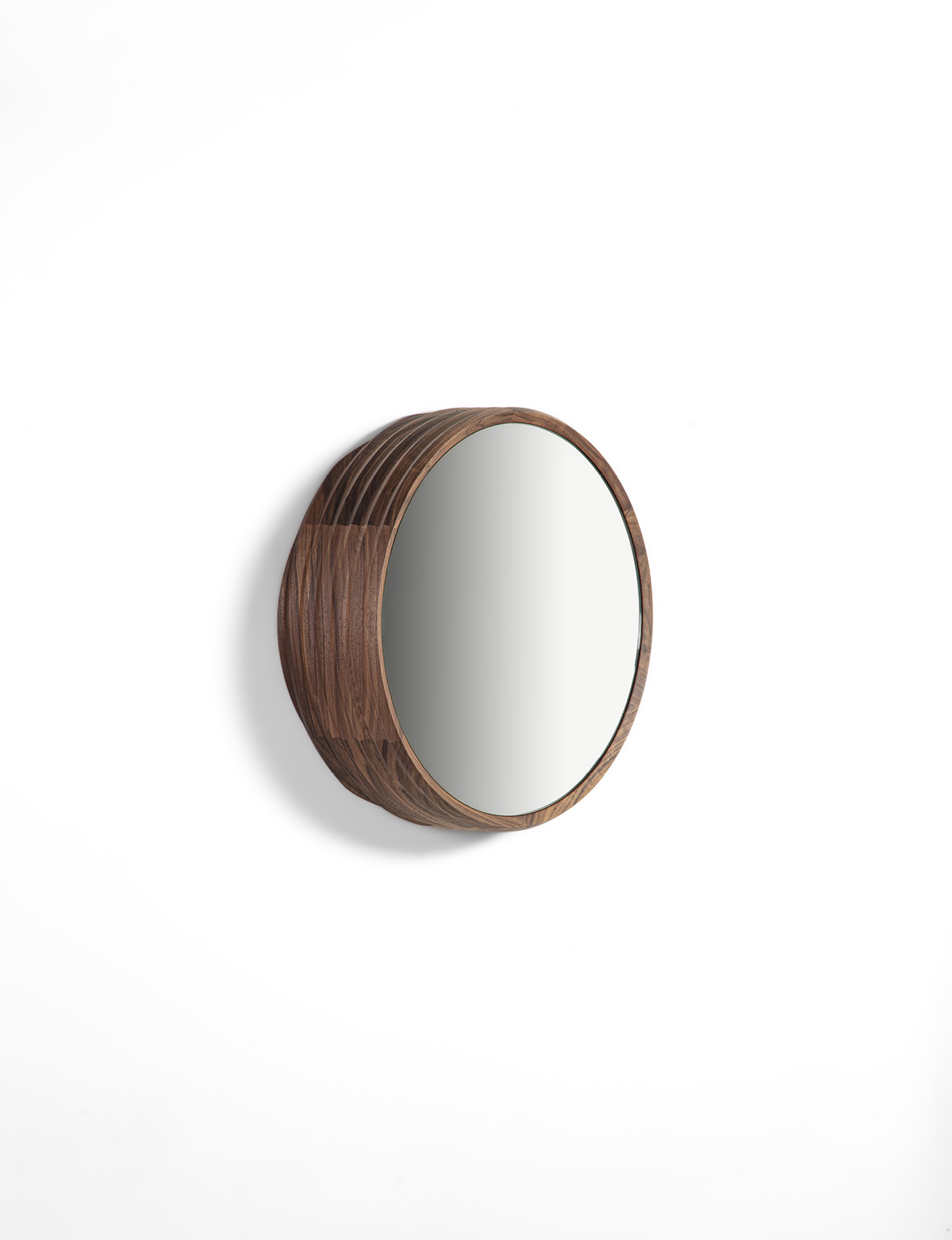 Collection of round wall mirrors with a solid canaletta walnut frame featuring different thicknesses and a threedimensional decorative pattern that defines the frame.