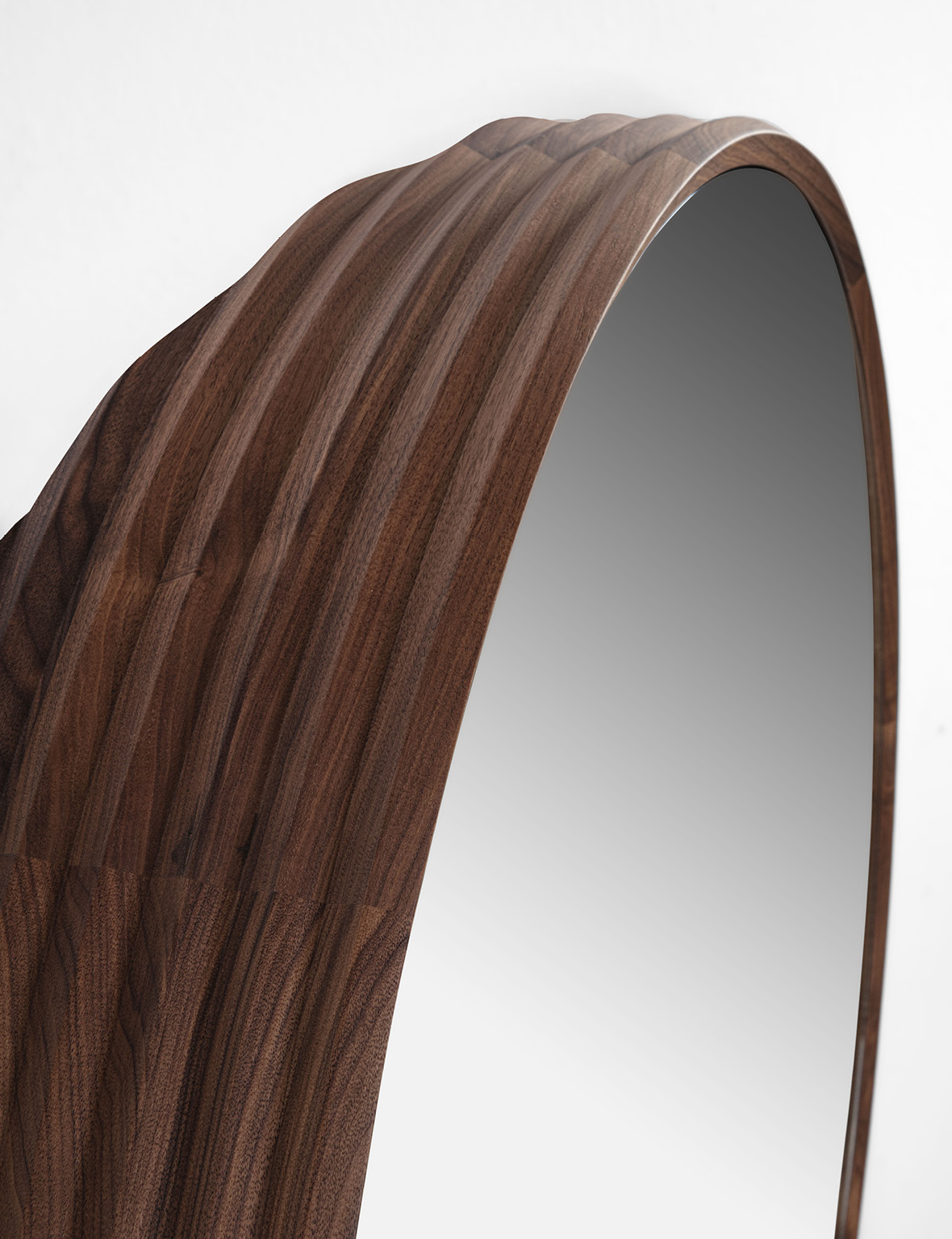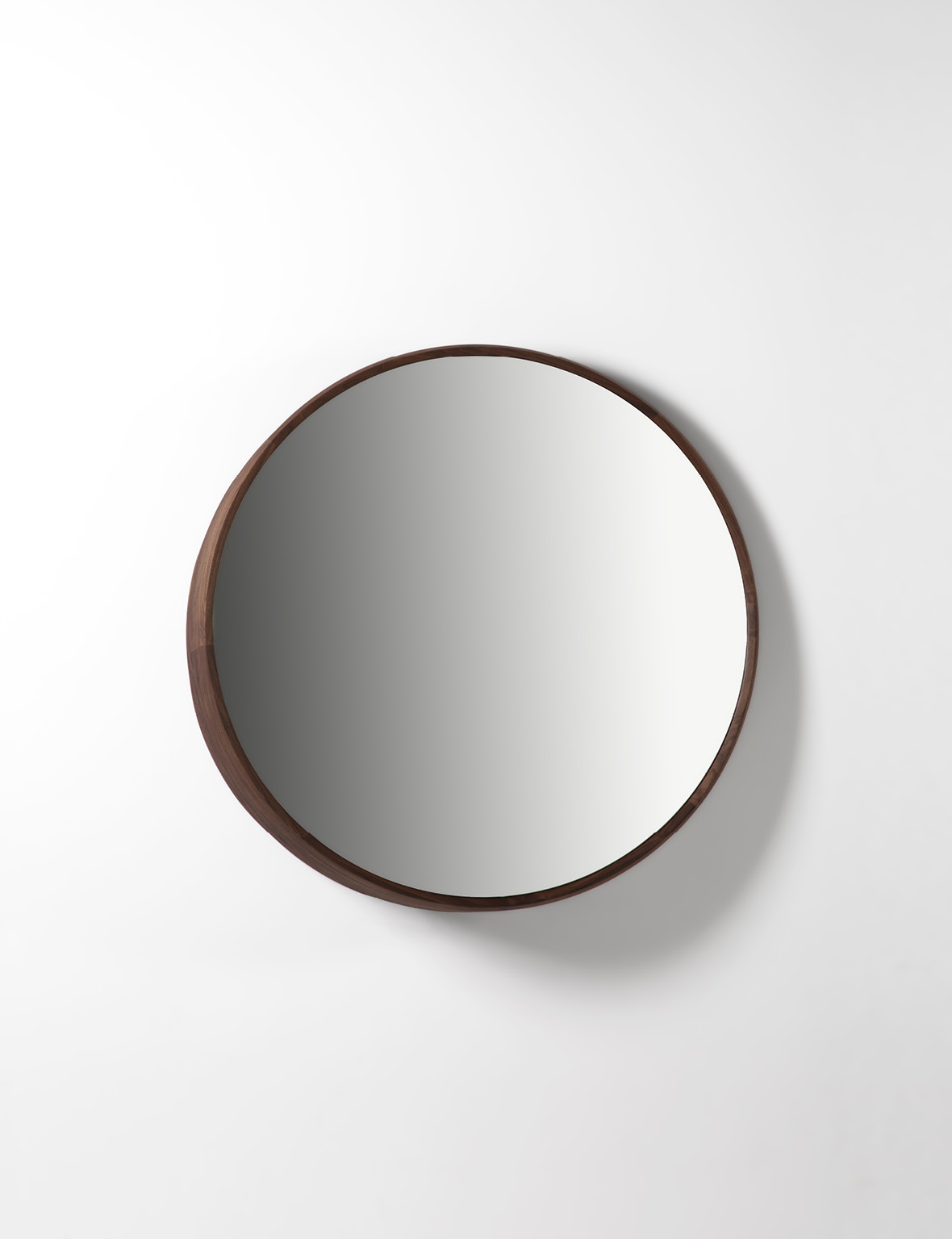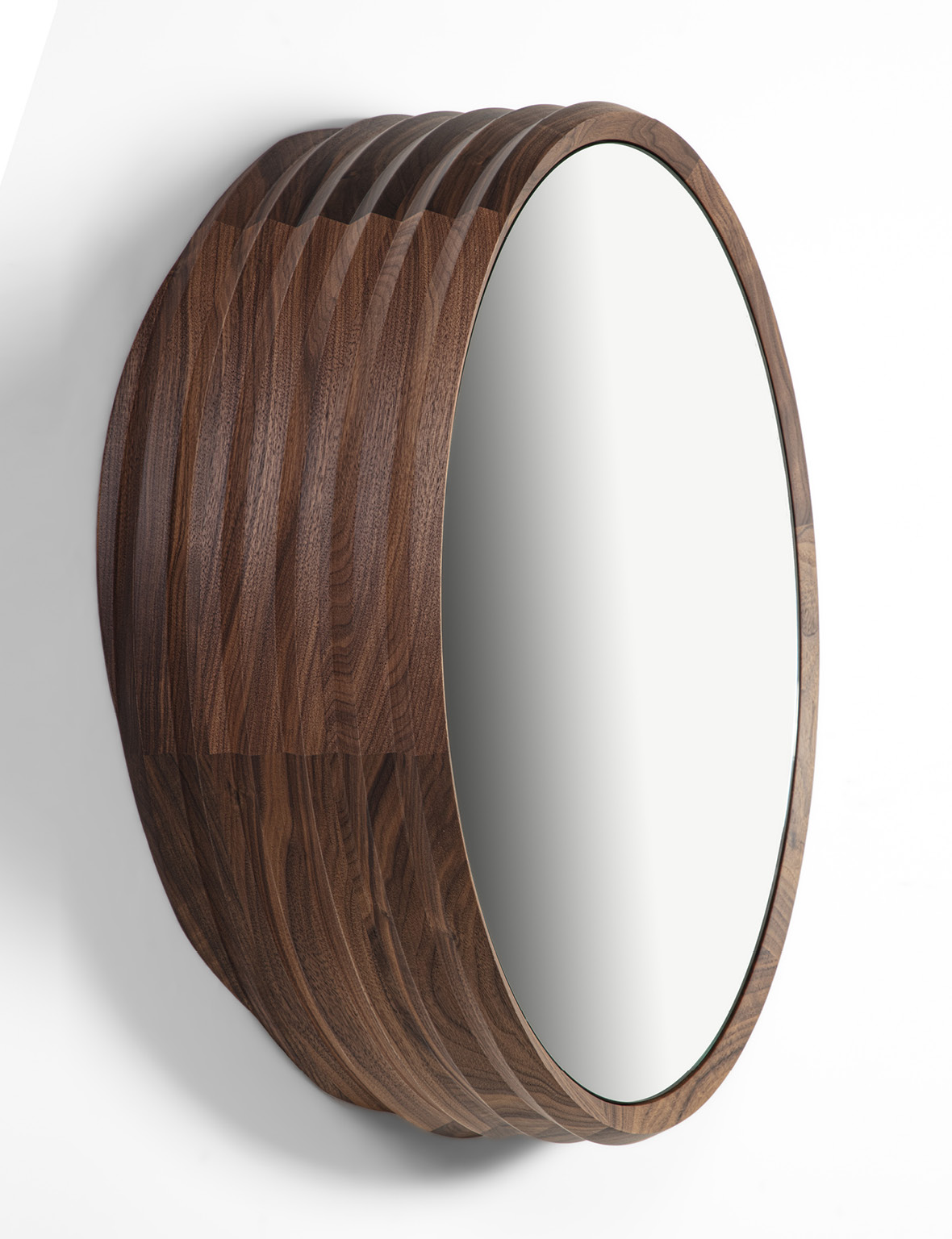 Collection of round wall mirrors with a solid canaletta walnut frame featuring different thicknesses and a threedimensional decorative pattern that defines the frame.