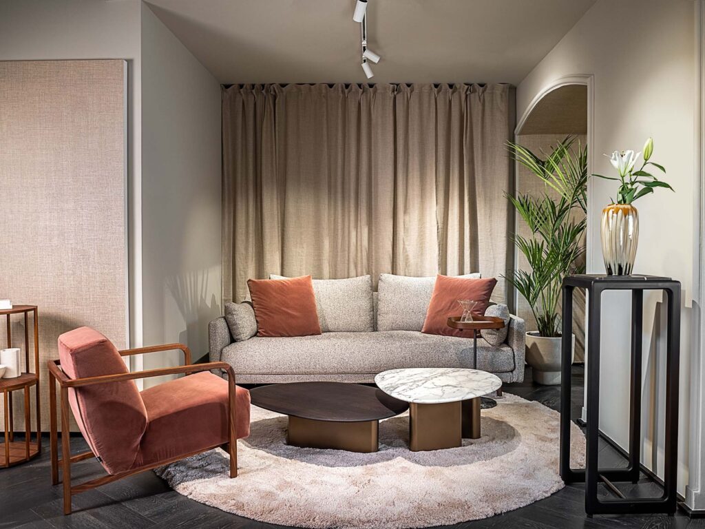 As soon as they cross the threshold of the showroom, visitors are welcomed into a lounge area designed to immediately convey the warm and sophisticated atmosphere that characterizes the Porada Home. The stars of the space are a two-seater Klem sofa and the Callisto Brillo coffee table, in one of three new lacquered finishes, the greige.