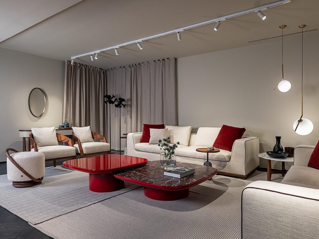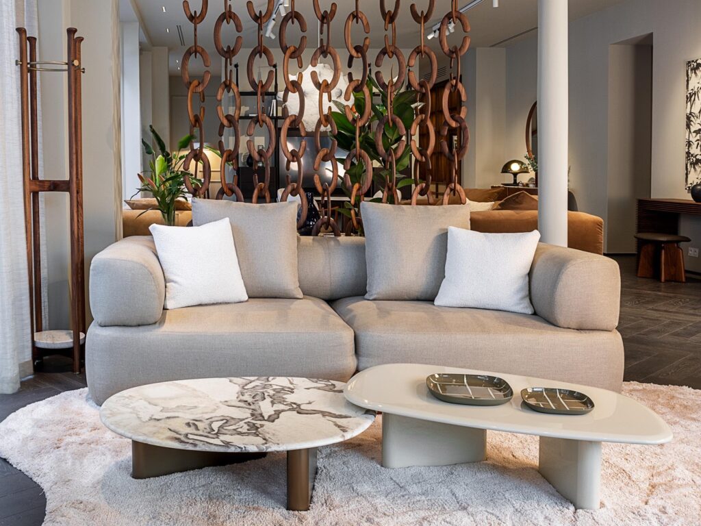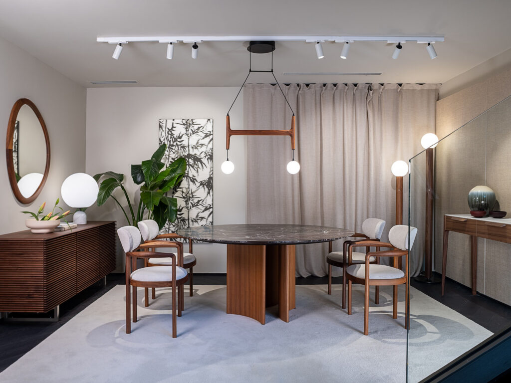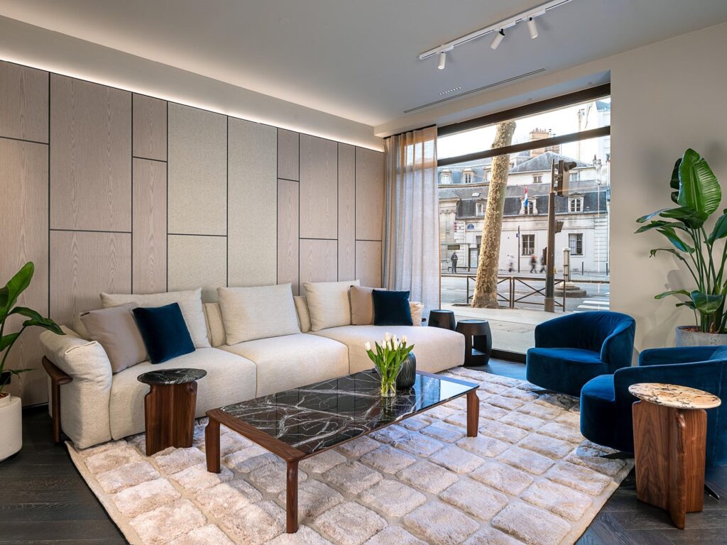 On the opposite side of the entrance, a pair of Koji sofas placed facing each other define a second conversation area. Between the two sofas is a Ziggy coffee table, flanked by a Côte side table in Canaletta walnut, emphasising the continuous dialogue between natural materials and craftsmanship.