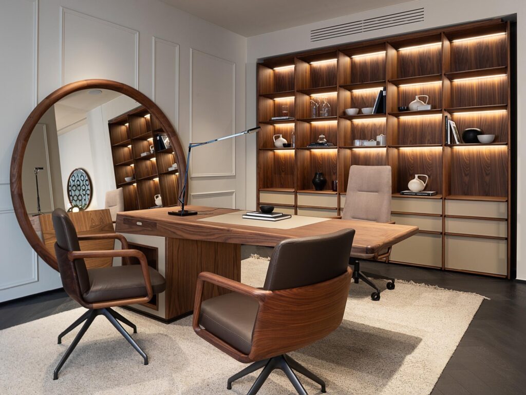 The largest room on the lower level is dedicated to a reception lounge, where a pair of Kirk sofas – reintroduced to the general public at the 2025 Salone del Mobile – are arranged in a conversational layout. Completing the scene are two Enook Brillo coffee tables, one of which is entirely lacquered in the new rouge brun finish, together with Nodo coat racks and a Rami console table, creating a coherent whole that reflects the balance between design and craftsmanship that distinguishes Porada.