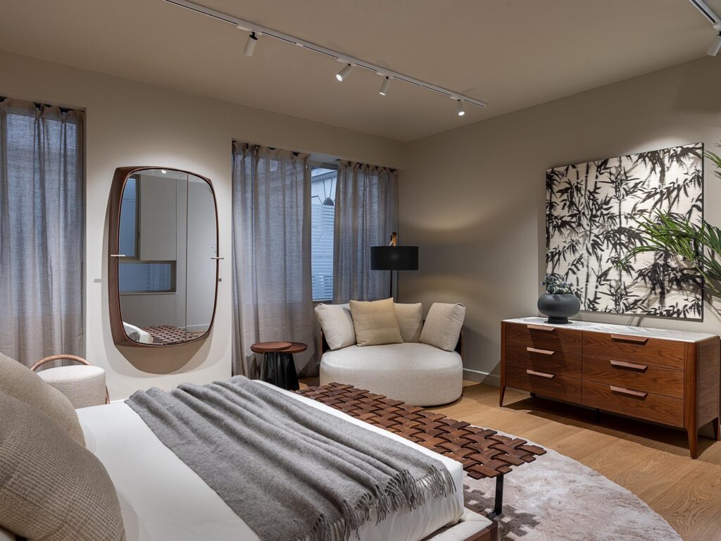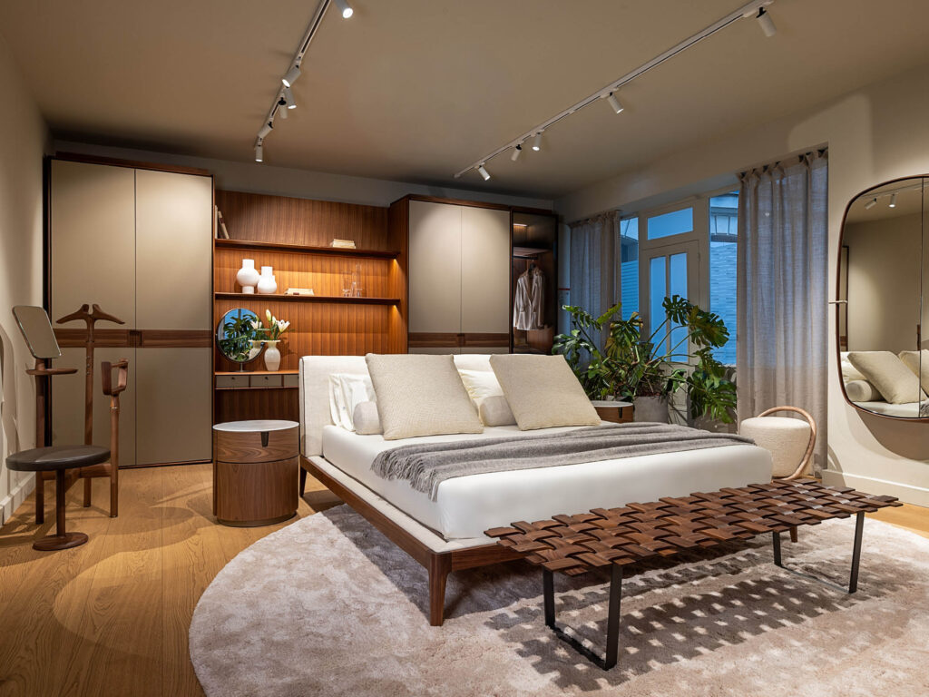 The ground floor tour culminates in the annex, now transformed into a master bedroom that represents the beating heart of the showroom. Three macro-elements are the protagonists of this environment: the My Closet wardrobe, complete with an integrated desk area and designed as a backdrop for the Ziggy Bed Soft; to complete the layout, a Calin XL armchair creates a small relaxation area, a private retreat within the suite.